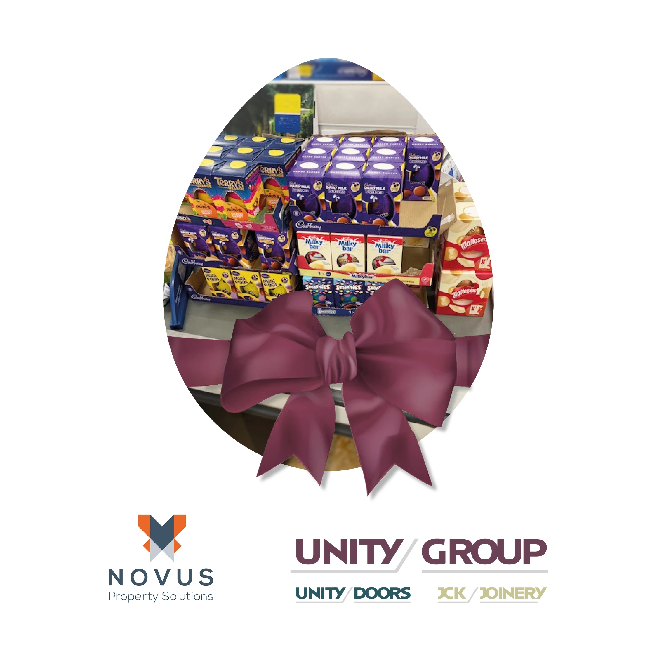 Leon Watson, Unity Doors’ Senior Contracts Manager put forward the idea to support Novus’ Property Solutions Social Value initiative, and as a result Unity Doors have matched their donation, enabling their Customer Liaison Officer, Emma Mcqueenie, to purchase 64 Easter eggs!